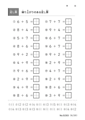 詳しくは「注意事項と免責事項」に記載していますが、 このプリント「繰り上がりのある足し算(答え付き)」は、「注意事項と免責事項」の範囲内であれば、ご自由に使用することができます。