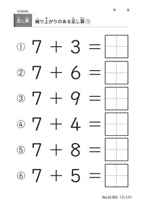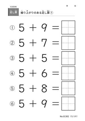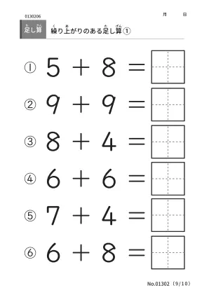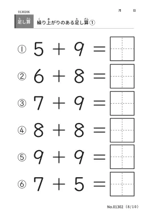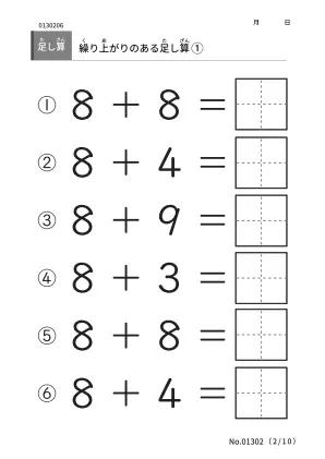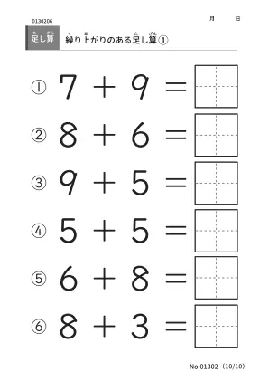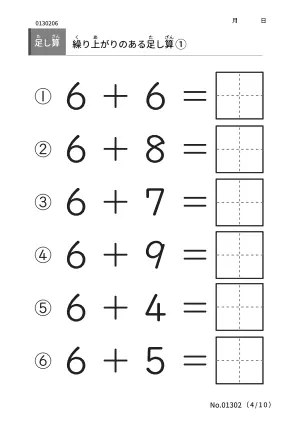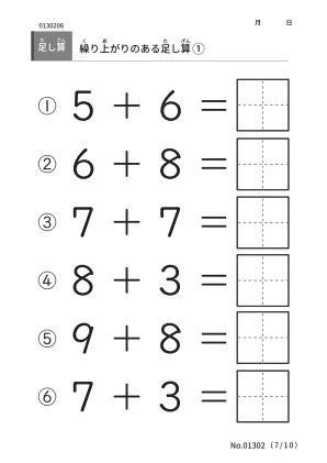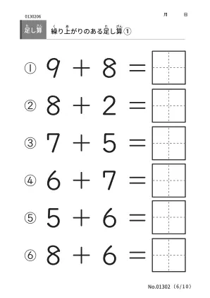 足される数が順番に並んでいるので少し計算しやすい「繰り上がりのある足し算」プリントです。1ページに6問、合計で10ページの練習問題を用意しています。