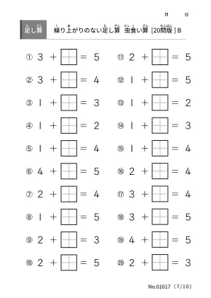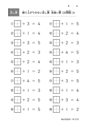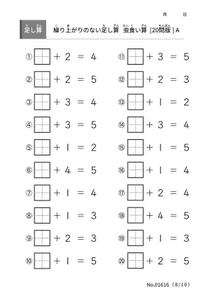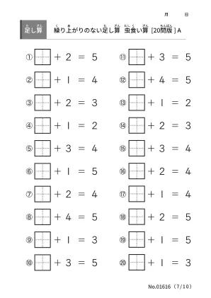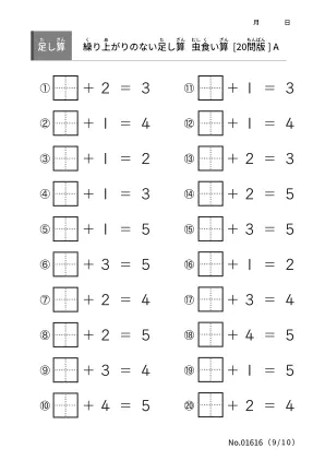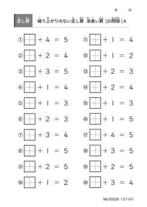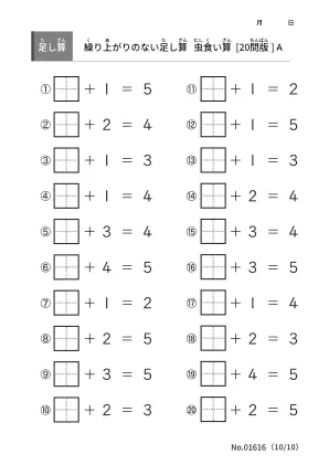 1ページ20問ある「繰り上がりのない足し算 虫食い算」無料ダウンロード