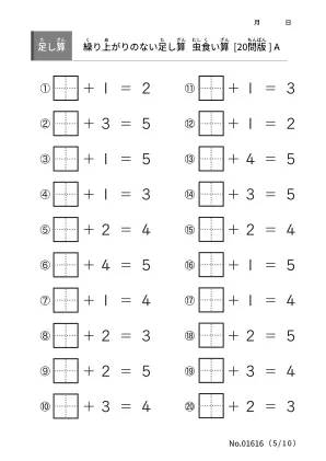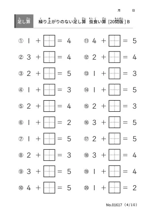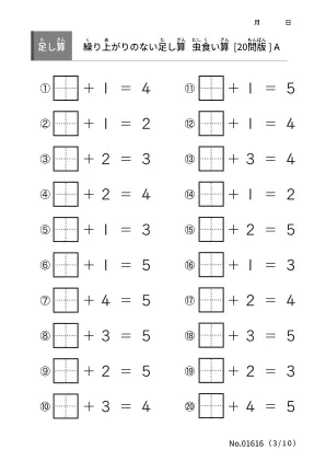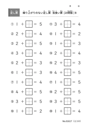 このプリントは、幼児向けに、楽しく遊びながら繰り上がりのない足し算を学習できるよう、虫食い算形式にしています。「虫食い版の繰り上がりのない足し算」を1ページに20問、合計で10ページの練習問題を用意しています。
