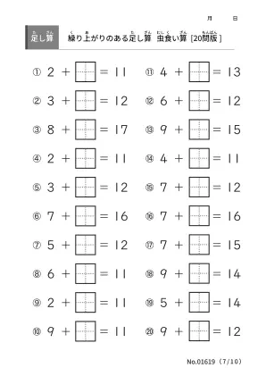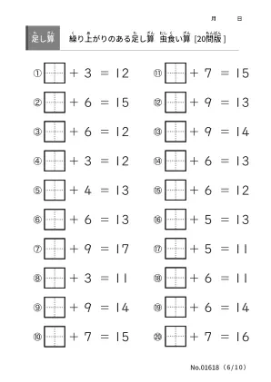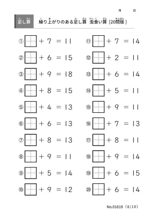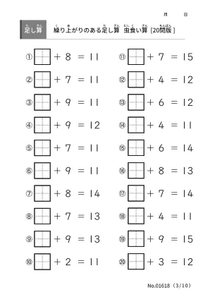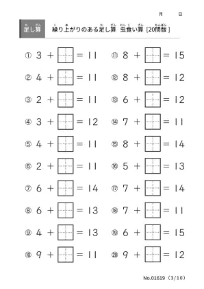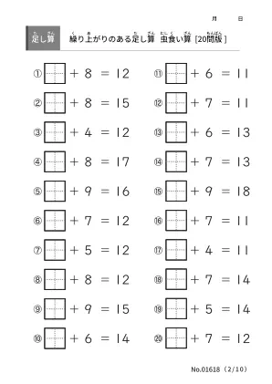算数の学習範囲に2桁の足し算が加わる前に繰り上がりのある足し算をマスターしたいです。虫食い算のプリントで算数力を高めていきましょう。