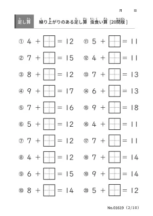 繰り上がりのある足し算を練習できる、虫食い版プリントを無料で提供します。繰り上がりのある足し算が苦手気味な子におすすめです。1ページに20問、合計で10ページの練習問題を用意しています。