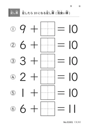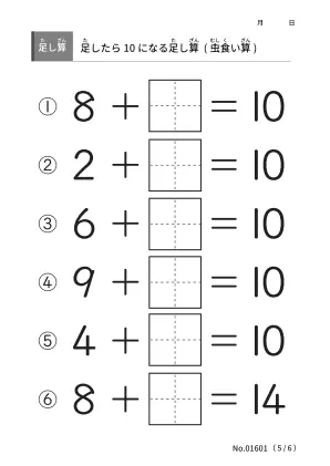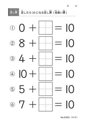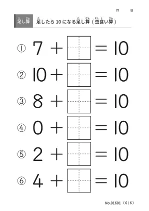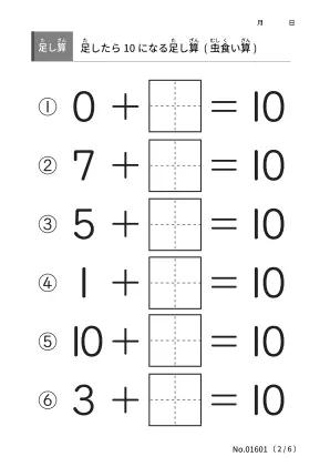 このプリントは、幼児向けに、楽しく遊びながら繰り上がりのない足し算を学習できるよう、虫食い算形式にしています。答えが10になっている「虫食い版の足し算」を1ページに6問、合計で6ページの練習問題を用意しています。
