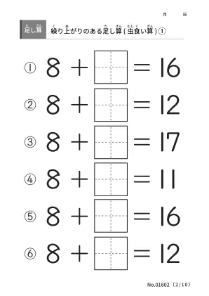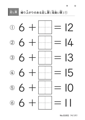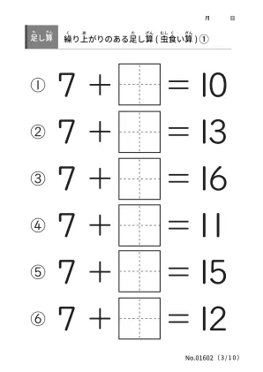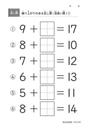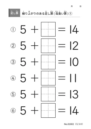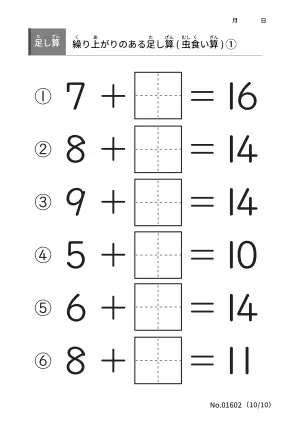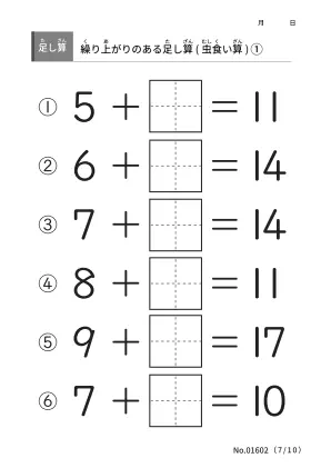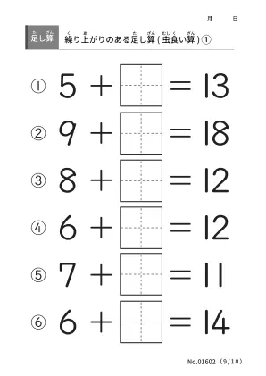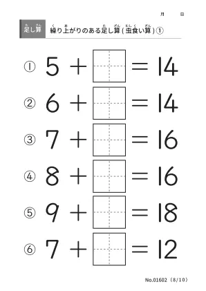 繰り上がりの足し算の虫食い版は繰り下がりのある引き算につながるプリントにもなっています。