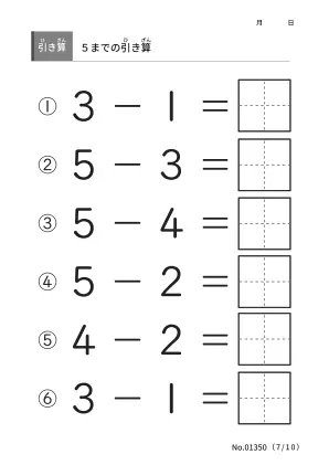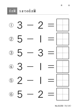 詳しくは「注意事項と免責事項」に記載していますが、 このプリント「5までの引き算」は、「注意事項と免責事項」の範囲内であれば、ご自由に使用することができます。
