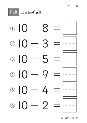 プリント概要10から引く引き算は、小学校1年生で学ぶ重要な算数の基礎。問題を解き進めることで、10の構成を理解することができます。