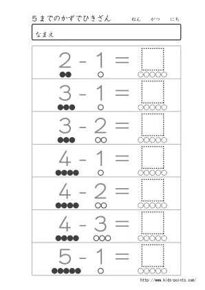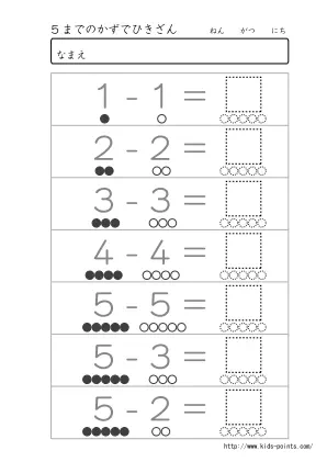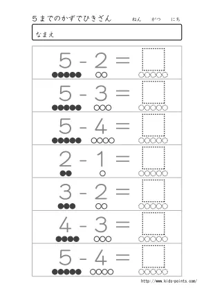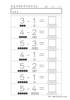 詳しくは「注意事項と免責事項」に記載していますが、 このプリント「5までの数を使う引き算」は、「注意事項と免責事項」の範囲内であれば、ご自由に使用することができます。