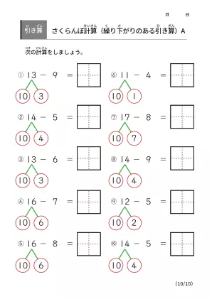 詳しくは「注意事項と免責事項」に記載していますが、 このプリント「さくらんぼ計算の引き算A」は、「注意事項と免責事項」の範囲内であれば、ご自由に使用することができます。