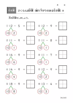 繰り下がりのある引き算をわかりやすく計算することができるプリントです。