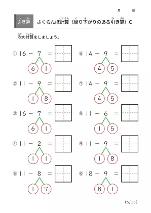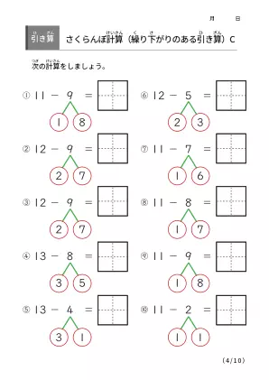 繰り下がりの計算がスムーズにできるになるプリントです。