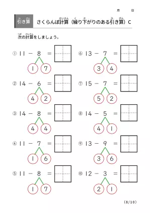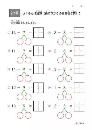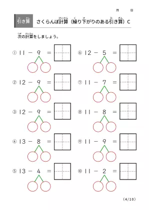 数の基本スキルを自然な形で身につく「さくらんぼ計算の引き算C」無料ダウンロード