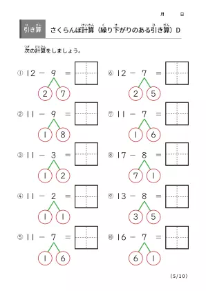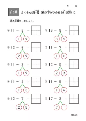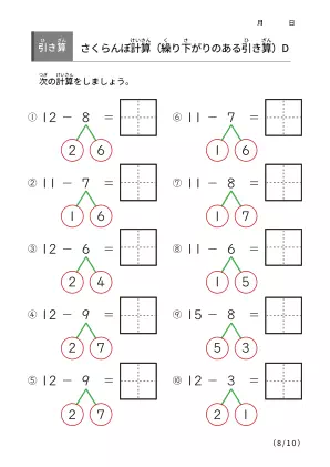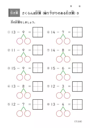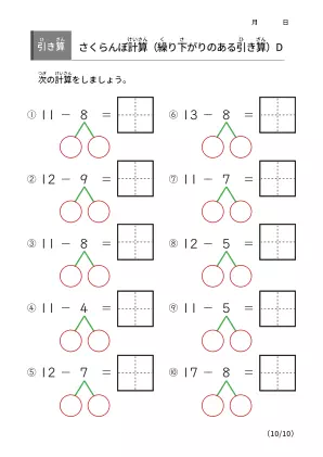 「10のかたまり」を大事にする計算「さくらんぼ計算の引き算D」無料ダウンロード