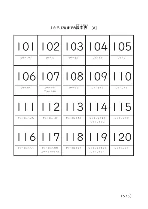 数字だけでなく、ひらがな表記も併記している幼児や小学1年生向けの1から120までのシンプルな数字表です。書き込みにも便利なレイアウトです。1から120まで数えられるようになりたい子向けのプリントです。