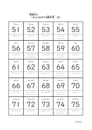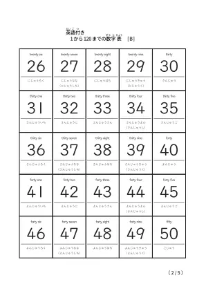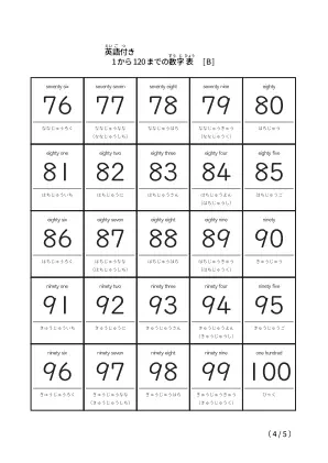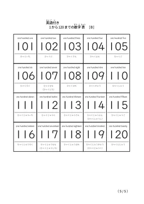 英語とひらがな表記「1から120までの英語付き数字表」無料ダウンロード