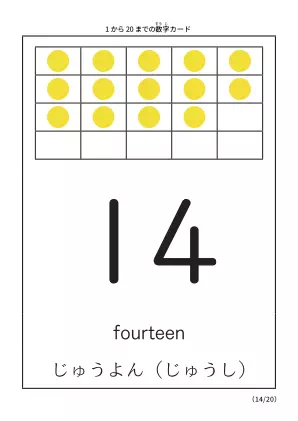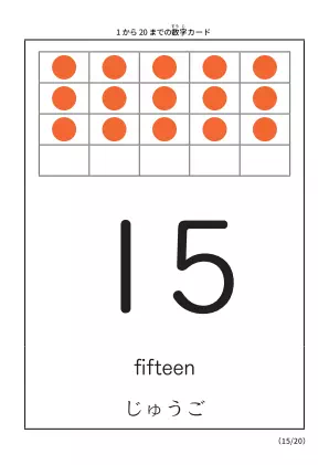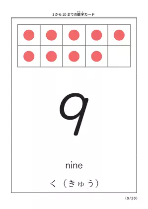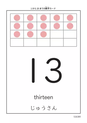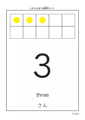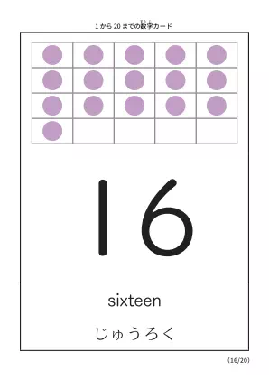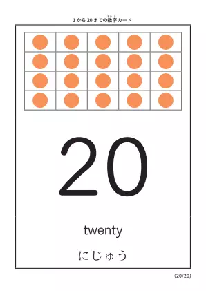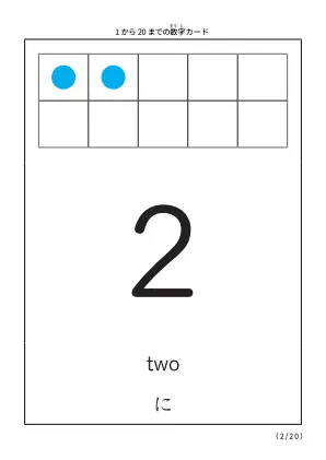 大き目サイズの数字表カード。カラフルな数字にあわせたドットがあるので数を意識しながら楽しめるカードです。英語の読みも書いているのも魅力のひとつ。まずは読んで数の大小を覚えましょう。