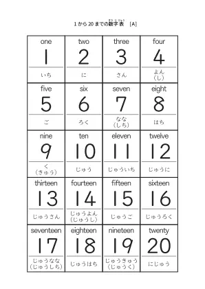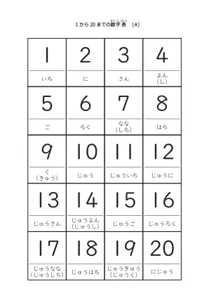 数字だけでなく、ひらがなや英語表記版もある幼児や小学1年生向けの1から20までのシンプルな数字表です。1から20まで数えられるようになりたい子向けのプリントです。