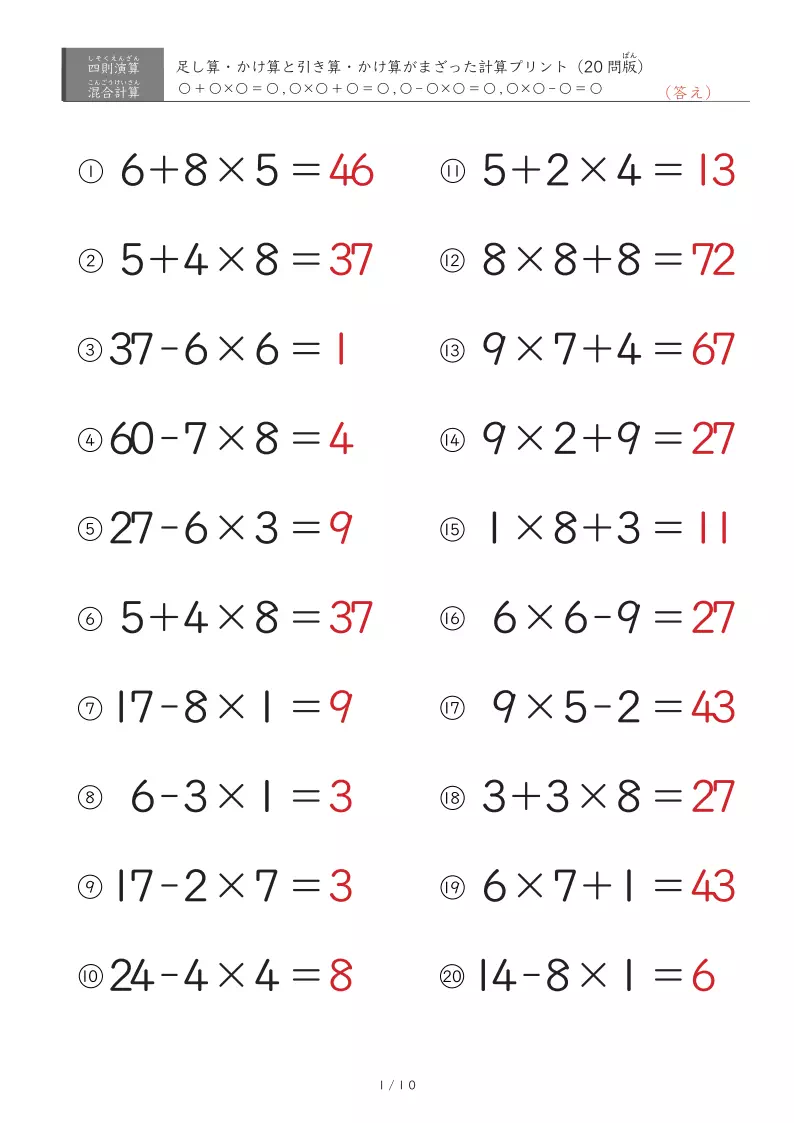 かけられる数、かける数も1から9までバラバラの掛け算のかけ算まとめプリントです。掛け算の総まとめに利用してください。100問10ページという十分に反復練習できる量が魅力です、