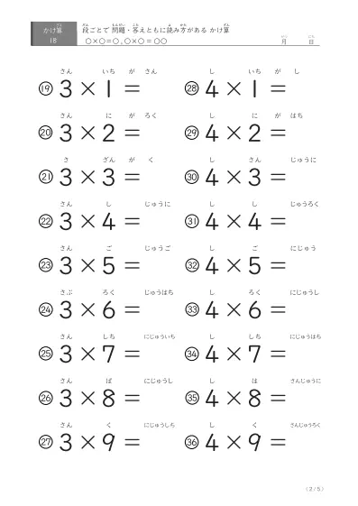 段ごと読み方付き かけ算(18問版)