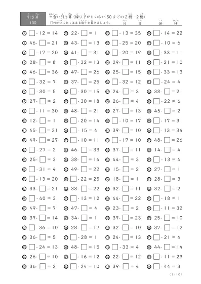 繰り下がりのある2桁同士の引き算に絞った学習プリントです。大きく50までと50以上99以下の2桁引き算、虫食い算版に分かれていますj。1ページ100問×10ページ用意しています。