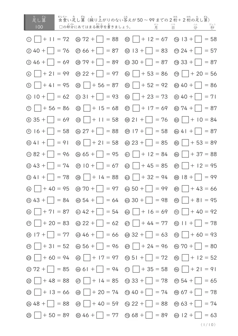 答えが50までの2桁足す2桁の繰り上がりのない虫食い足し算プリント100問、合計1000問。すべて繰り上がりのない計算です。欠けている数字を推理するパズル要素がある「虫食い足し算」なので難易度少し高めです。