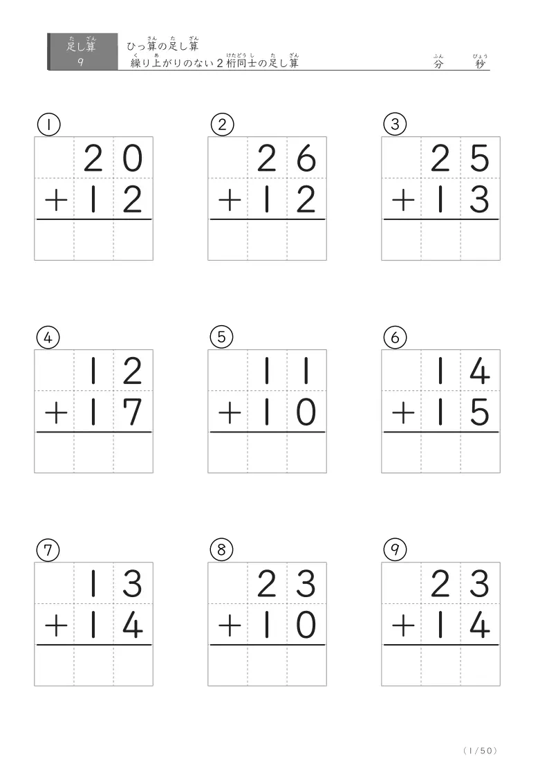 1の位、10の位をしっかり意識しやすい枠線がついている50までの2桁+2桁の足し算問題です。足し算、ひっ算の足し算学びはじめにぴったりなプリントです。お子さんの実力に応じて問題数を選んでいきましょう。