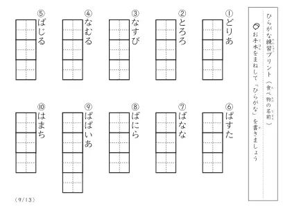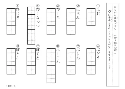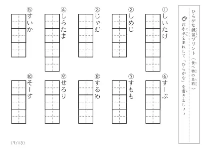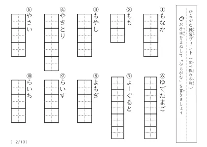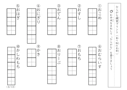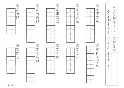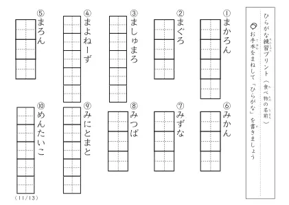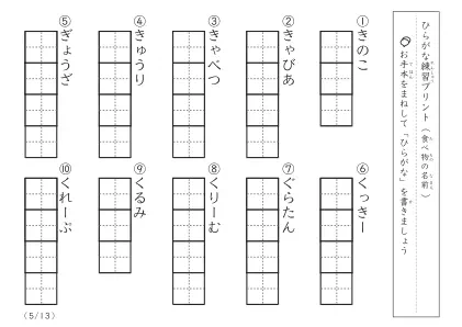 食べ物の名前をお見本にして「ひらがな」を練習する視写プリント。きれいにかけるように破線付きのます目が用意されているのでその中にバランスよく書けるようになりましょう。