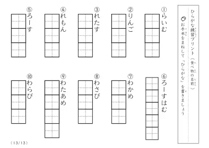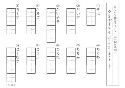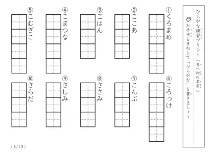 詳しくは「注意事項と免責事項」に記載していますが、 このプリント「ひらがな視写プリント(食物)A」は、「注意事項と免責事項」の範囲内であれば、ご自由に使用することができます。
