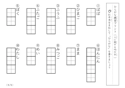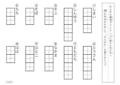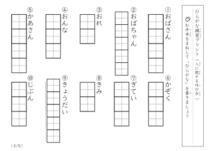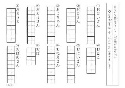 お見本の人に関する呼び方を「ひらがな」で書いていく視写プリント。きれいにかけるように破線付きのます目が用意されているのでその中にバランスよく書けるようになりましょう。