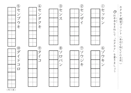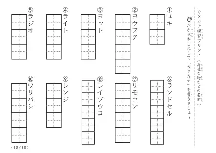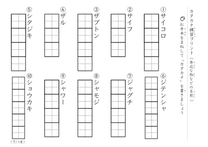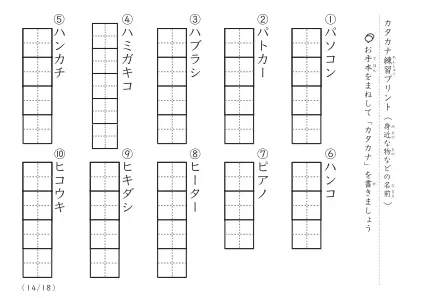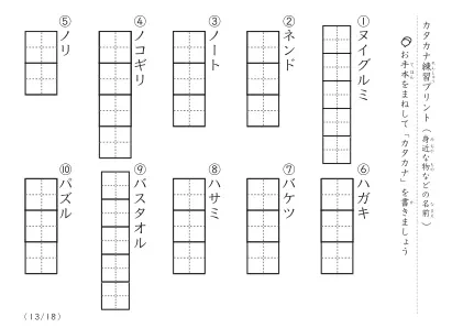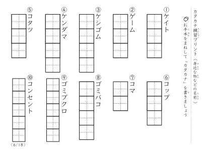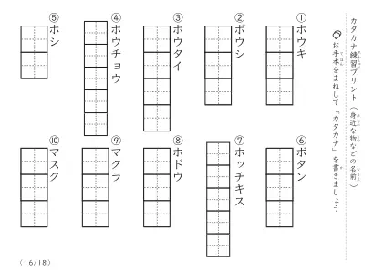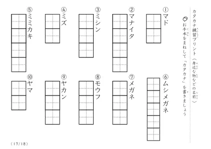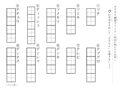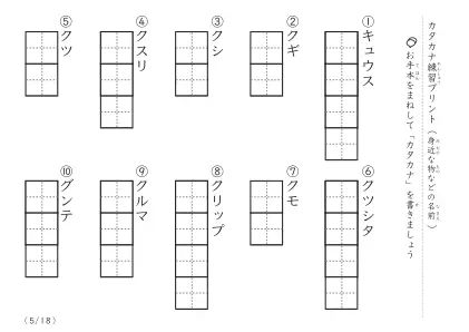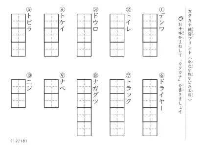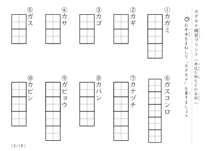 身近なモノなどの名前を「カタカナ」で書いていく視写プリント。きれいにかけるように破線付きのます目が用意されているのでその中にバランスよく書けるようになりましょう。