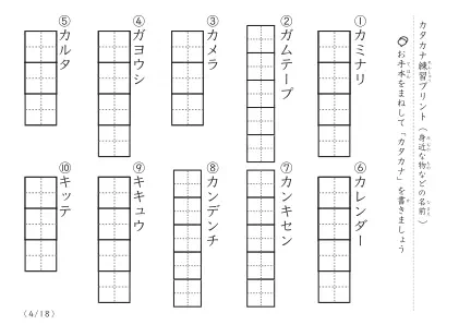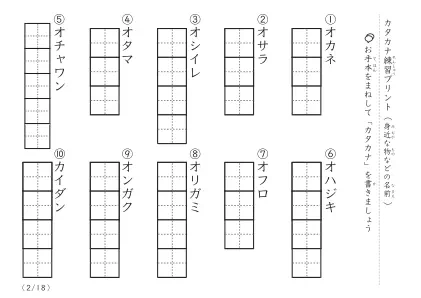 身近な名前を書いていくプリント「カタカナ視写プリント(身近)A」無料ダウンロード