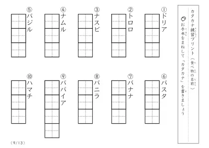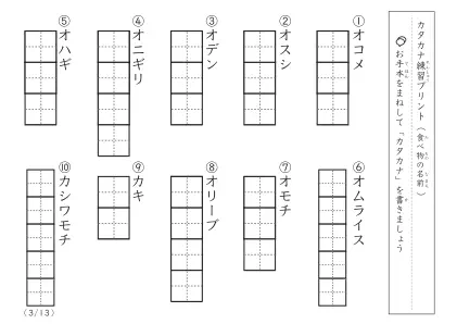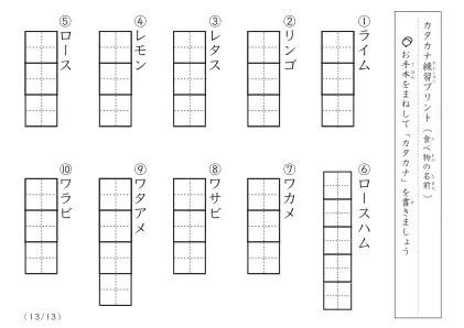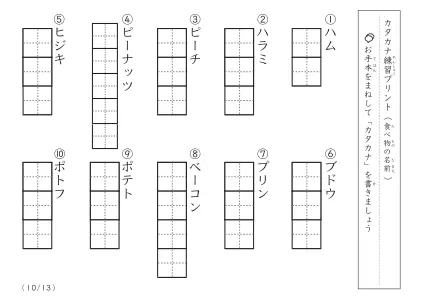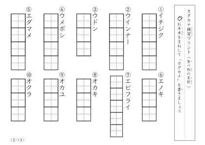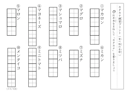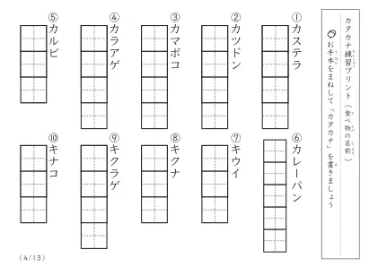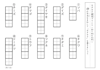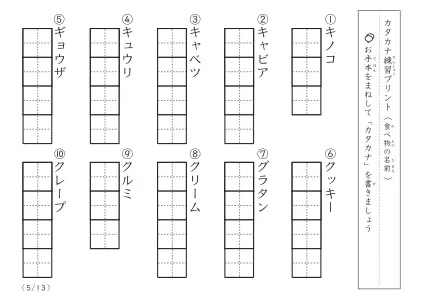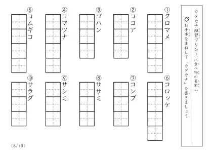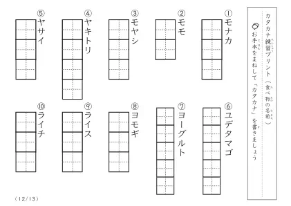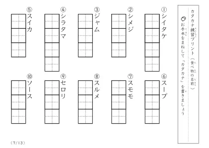 食べ物の名前をお見本にして「カタカナ」で書いていく視写プリント。きれいにかけるように破線付きのます目が用意されているのでその中にバランスよく書けるようになりましょう。