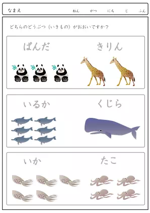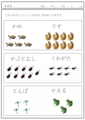 生き物の数を比べて多い方を答える問題です。