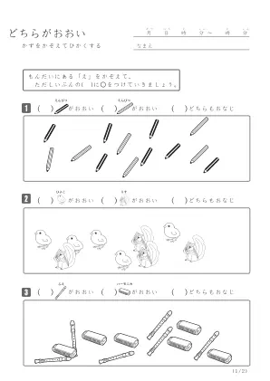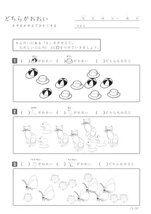 このプリントはイラストの数を数えてどちらが多いかを調べて、多い方に〇をつける問題プリントです。比べるイラストがバラバラに並んでいるのでしっかり数えよう。おまけでイラストに色を塗って楽しむこともできます。