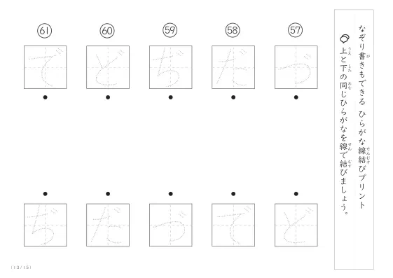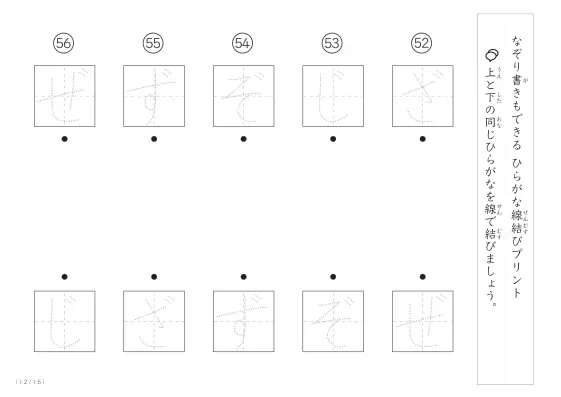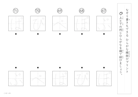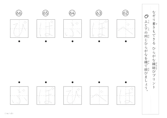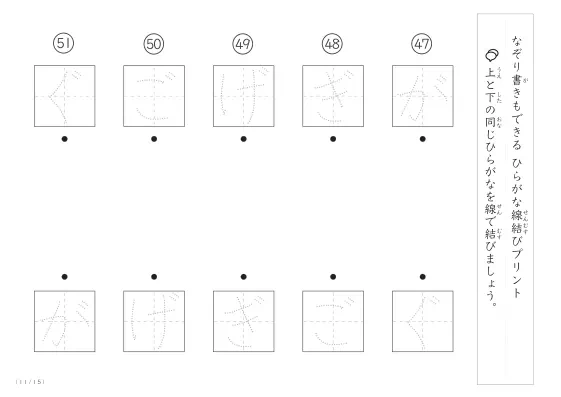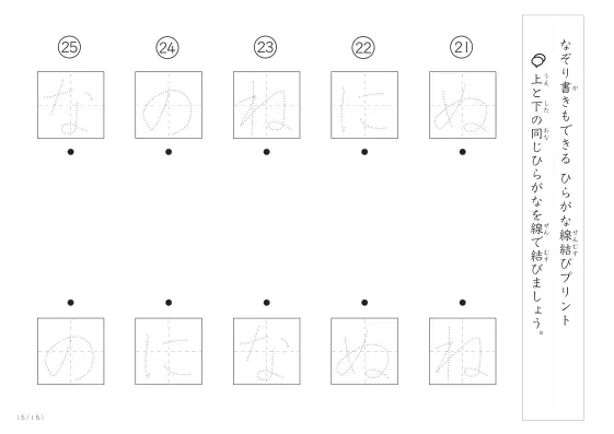 各ページに5つのひらがな文字が上下に配置されているので同じ文字を探して線を結ぶプリントです。あ行から濁音、半濁音まで用意しています。