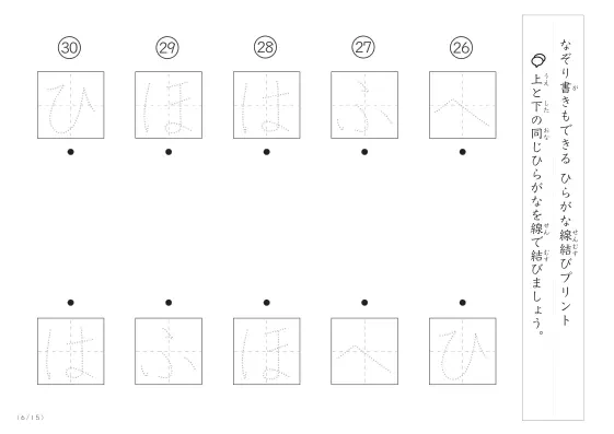 ひらがな同士を線で結ぶ練習プリント。なぞり書きもできるので認識力と書き方の練習を同時に行える効率的なプリントです。