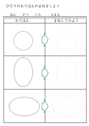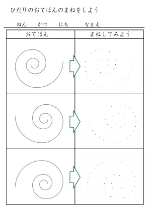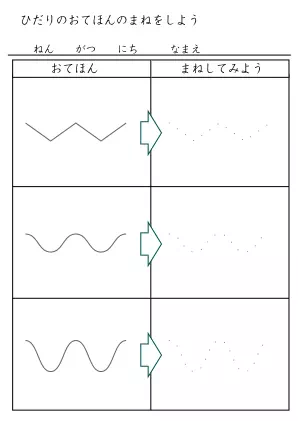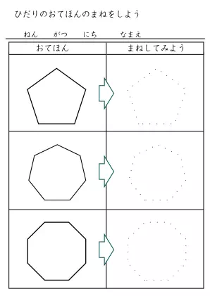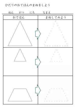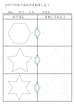 お手本を参考に線を結んで図形などを完成させていくプリントです。