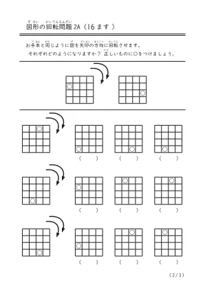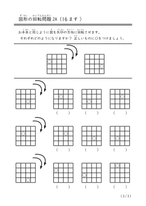 16ますの図を右方向に2回転させたら向きがどうなるかを頭の中で考えて答える図形問題です。幼児だけでなく中学生にもなっても役立つ空間認識力です。