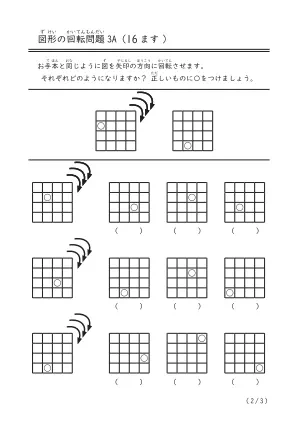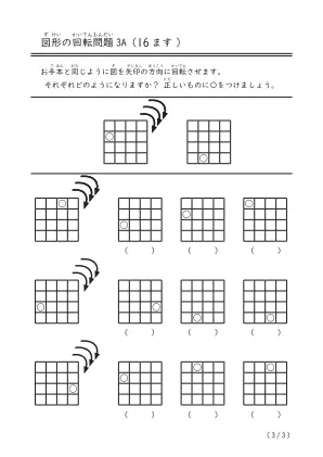 16ますの図を右方向に3回転させたら向きがどうなるかを頭の中で考えて答える図形問題です。幼児だけでなく中学生にもなっても役立つ空間認識力です。