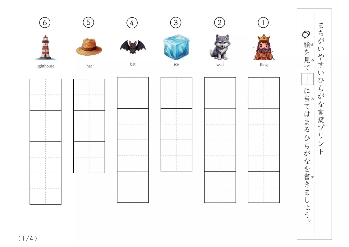 | プリント内容 | 絵を見て答えるひらがな問題 |